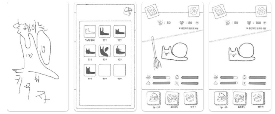 UI를 설계할때는 이 게임 내에서 비슷한 항목의 컴포넌트는 가급적 한번에 볼 수 있도록 하고자 했는데. 다마고치의 기본적 요소인 밥주기, 놀아주기, 청소하기를 하단에 크게 배치하여 한눈에 확인할 수 있도록 했고. 달팽이의 스테이터스 또한 버튼 위에 바로 배치해서, 행동 버튼을 눌렀을 때 시선 내에서 자연스럽게 스테이터스의 증감 또한 확인할 수 있도록 했다.